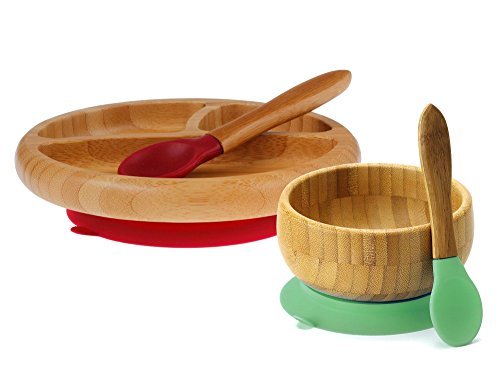 -. Feature : BAMBOO BABY: Say goodbye to messy mealtimes with your little one! Foolproof functionality meets modern design with Avanchy's bamboo baby feeding products. These stylish supplies are crafted from real, biodegradable bamboo and feature bright, funky silicone accents for a fun pop of color. They are lightweight, can attach to any flat surface, and will last for years of use. / GREAT VALUE: Maven Gifts has paired the Bamboo Stay Put Suction Bowl in green with the Bamboo Stay Put Suction 3-Section Plate in magenta to help you save. Both the bowl and plate come with a silicone spoon. Avanchy's Stay Put Suction design features a removable rubber suction piece on the bottom of each dish for vacuum-sealed, spill-proof attachment. / EASY TO USE: To activate the Airtight Lock mechanism, firmly press your bowl/plate onto a flat surface until you hear all the air come out. Place the easy release tab facing the opposite side of your little one. To release, simply press the tab and the suction piece pops off just like magic! / COMPLETELY SAFE: Avanchy's products are always BPA, PVC, lead, and phthalate free, making them completely safe for babies and toddlers. To clean, hand wash with soapy, warm water and wipe dry. These products are not meant for microwaves, ovens, or dishwasher. / PRODUCT SPECIFICATIONS: Includes (1) Bamboo Stay Put Suction Bowl in green, (1) Bamboo Stay Put Suction 3-Section Plate in magenta, and (2) food-grade silicone spoons, in green and magenta. The bowl measures 4.5" in diameter and 2.75" high. The 3-section divided plate measures 6.5" in diameter and 1.5" high. Each spoon measures 5.5" long. Each spoon measures 5.5" long. For children ages 6 months and up.