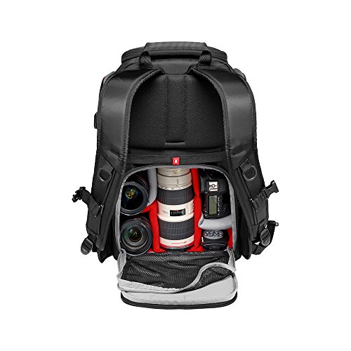 The lower part of the bag is dedicated to the photographic equipment and safely holds a professional DSLR camera body with up to 3 lenses thanks to the renowned Manfrotto Protection System including a 70-200mm lens