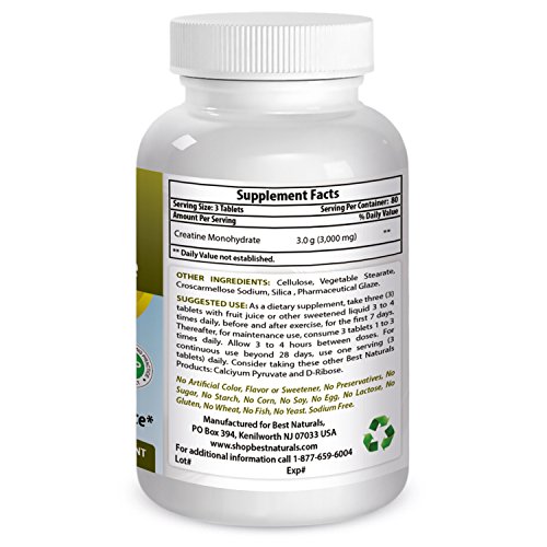 -. Binding : Health and Beauty -. Brand : Best Naturals -. EAN : 0764442669859 -. Feature : Enhance Muscle Perfmance / Helps buffer lactic acid buildup / accelerates power & recovery from excercise / Optimizing energy metabolism by maintaining higher levels of the body's energy compound adenosine triphosphate / All Best Naturals products are manufactured in accordance with Good Manufacturing Practices (GMP), among the highest standards in the world -- Proudly Made in USA -- Purity & Potency Guaranteed -. IsAdultProduct : 0 -. Label : Best Naturals -. Manufacturer : Best Naturals -. MPN : 817716014067 -. PackageQuantity : 1 -. PartNumber : 817716014067 -. ProductGroup : Health and Beauty -. ProductTypeName : HEALTH_PERSONAL_CARE -. Publisher : Best Naturals -. Studio : Best Naturals -. Title : Best Naturals Creatine 1000 mg 240 Tablets -. UPC : 764442669859
