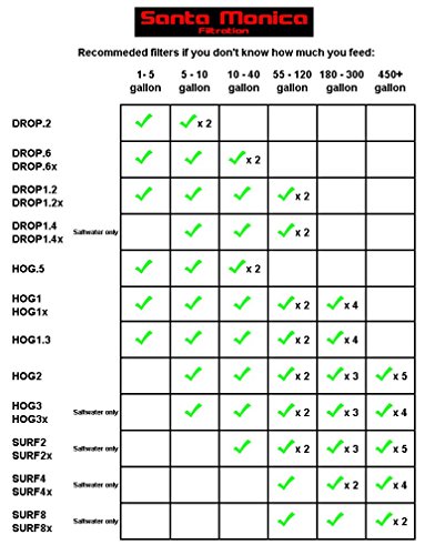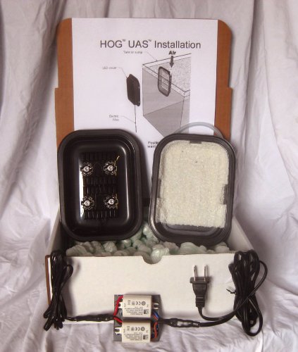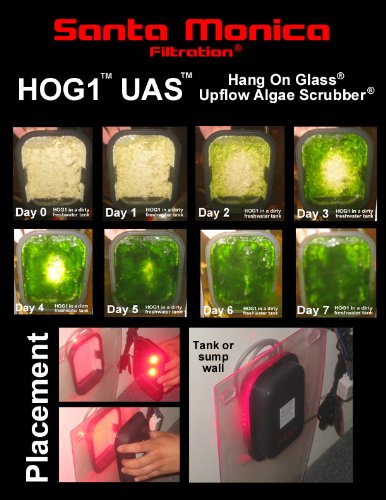 This hog1x scrubber has over 24 square inches (150 square cm) of green grabber algal growth surface, which is designed to absorb the nutrients from this much feeding per day: 1 frozen cube, or 10 pinches of flake, or 10 square inches (62 square cm) of nori, or 2.8 Grams of pellets the number of gallons or liters of water in your tank or sump does not matter. If you feed more than the above amounts, you can get multiple hog1x units; multiple units are preferred over one larger unit because you can clean one unit per week, and because you'll always have one unit filtering while the other one starts growing again after a cleaning. Multiple units are also good for backup. The magnets attach the outside cover to the inside cover, through the aquarium wall, and can be used on glass or acrylic 1/4 inch (6.25 Mm) to 1/2 inch (12.5 Mm). Not more. If your aquarium wall is 3/4" (19mm) or bigger, then put the hog1x on your sump instead; it will work the same. No electrical parts go inside the aquarium; only air. And the air bubbler is already supplied (it's sealed behind the growth surface), so you don't have to get an air stone. The bubbler is simply vinyl air hose that has been cut lengthwise, and with cross-cuts, to form little flexible segments that are both adjustable and open-able to allow for easy cleaning. This hog1x will run on both 120v and 240v, and comes with a 10 ft. (300 cm) power cord with a U.S. Plug. If you require a different plug you can get an adapter at any local hardware or travel store, or online, or you can cut off the U.S. Plug and install your own plug from a hardware store. Get a timer so you can run the LEDs for up to 22 hours per day (freshwater can try 24). Requires an air pump that can pump at least 1.0 Liters per minute (.04 Cfm), which medium-cost air pumps can usually handle. Pumps that say they can handle 2 or more air stones/outlets, or pumps with 2 tubing attachments instead of one, will usually be more than enough. US patent 9,115,008.Feature