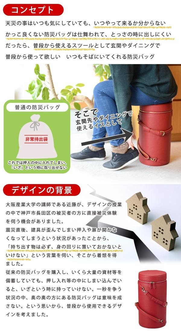| 緊急時の防災バッグは、奥にしまいがち・・・。そんな防災バッグをいつも身近においておけるようにデザインしたスツールを考案しました!スツールとして使用できるので、ダイニングの予備椅子としておいておいてもOK、玄関イスとしても使えるので、いつも身近に防災用品をおいておくことができます。お手持ちの防災グッズなどを是非保管してください。インテリアにもなじむデザインに仕上げています。 |