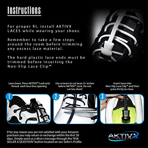 -. Feature : Life is an adventure and no matter where you are, you will never have to worry about tying your shoelaces again with the Original AKTIVX SPORTS® No Tie Shoelaces. Whether you're running a marathon or picking the kids up from school, our water resistant no tie shoe laces are the latest advancement in running footwear and accessories. / AKTIVX SPORTS Laces are perfect for Runners, Health and Fitness Enthusiast, Cross Fitters, Basketball Players, Football Players, Soccer Players, Baseball Players, Tennis Players, and Professional Athletes. Men, Women, Kids, Senior Citizens and even children with special needs will benefit from our laces which lock your shoelaces in place. Great for sensitive feet or those recovering from foot injury like plantar fasciitis. / Once installed, these shoelaces will shave valuable time off your morning routine and help you get your day started even faster! 2016 AKTIVX SPORTS® Laces easily install on your favorite pair of athletic shoes in under 5 minutes. These locking elastic shoe laces are one size fits all. For the best fit, slip your shoes on your feet before installing. Each package contains 2 locks, 2 elastic shoelaces in your choice of 11 colors, and 2 Non-Slip Lace Clips®. / AKTIVX SPORTS Laces use the highest quality materials which conforms to your feet for better comfort and support as opposed to normal nylon or cotton laces. Because they reduce pressure points on the top of your foot, they help you feel better thus becoming more productive throughout the day. It is like wearing a new pair of shoes every single day! / AKTIVX SPORTS GUARANTEE: we guarantee the use of your purchase on a single pair of shoes. If for any reason you are unsatisfied with your Amazon purchase within the first thirty (30) days, return them for a no questions asked return.