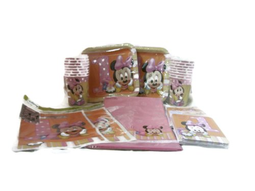 -. Feature : All the Minnie Mouse party supplies you need in one place to celebrate your little one's 1st birthday. This Party Supply Bundle includes 97 pieces. / Party Pack includes: (16) 9 oz cups, (16) 12"x12" napkins, (16) 7"x7" plates, (16) favor bags, (16) invitations with (16) envelopes, and (1) 54" x 96" table cover.