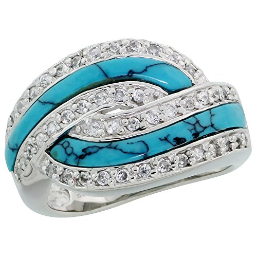Product Description This Beautiful Ring is crafted from Solid Sterling Silver and Inlayed w/ Synthetic Turquoise Stones. The CZ Stones in this piece of jewelry are Very Good Quality which significantly added allure to it. It has been Rhodium Plated to make it Anti-tarnish and give it a White Gold Look. It make a great Blue color accessory.