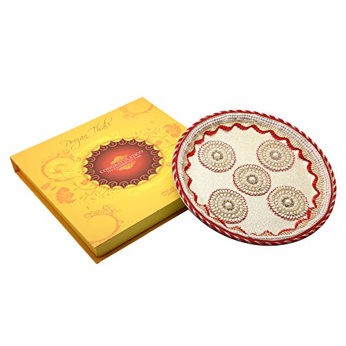 - Exclusively decorated poojan thali set with colorful pearls, zari work, beads, studs, stones, kundan work, motifs, lace work, brocade work and other premiun material along with all items used to perform a virtuous Pooja at your own place.