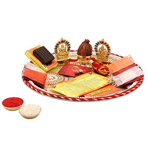 - Package Contains: 1 Decorated Pooja Thali, 1 Idol of Ganesh Ji, 1 Idol of Laxhmi Ji, 1 Pouch of kumkum, 1 pouch of Sindoor, 1 pouch of Akshat, 1 aarti book, 1 prarthna book, 1 packet of dhoop, 1 shreefal, 1 mouli bundle, 1 packet of mishery, 1 betalnut, 1 kalash, 2 containers.