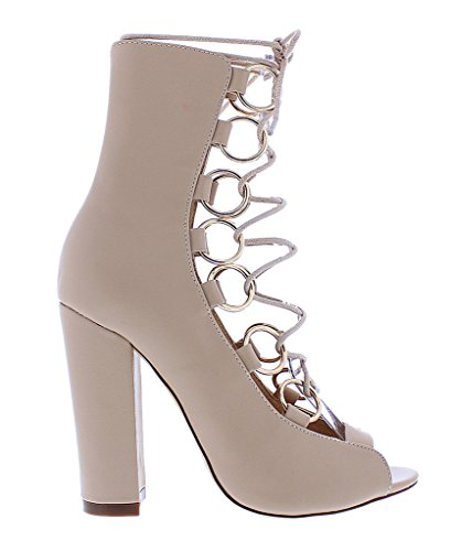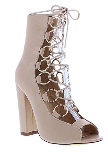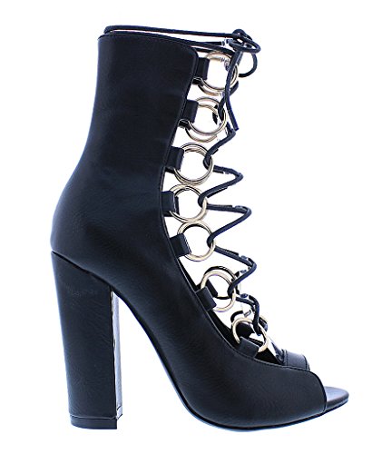 Binding : Apparel Product Description Make a Fashion Statement with these corset like lace up ankle high heel booties, featuring an open toe, contrast stitching, adjustable laces, a slightly padded insole for comfort, and an approximate 4.5 inch high stacked block heel 0