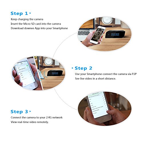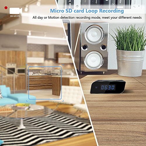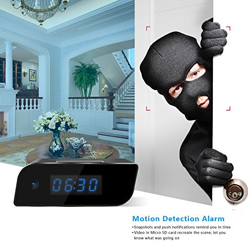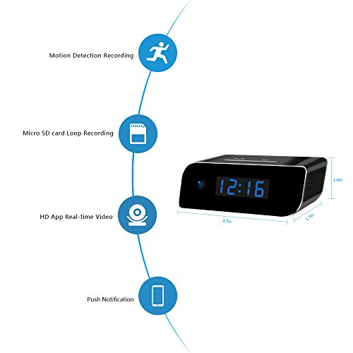 Mini camera hidden in the clock; features: HD App real-time video, motion detection alarm, Micro SD card loop video recording; simply set the clock time with only 2 buttons