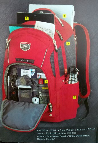 -. Binding : Electronics -. Brand : High Sierra -. Color : Black -. EAN : 0040176440187 -. Feature : Size: 19.5'' x 12.8'' x 7''. Capacity: 2624 cubic inches / Materials: Grid-Weave Duralite, Shiny Waffle Weave, Ballistic Duralite / Fits 17'' Laptop / Cushion Zone Computer /Tablet Storage / Suspended Back Panel -. Label : High Sierra -. Manufacturer : High Sierra -. Model : 716365 -. MPN : 716365 -. PackageQuantity : 1 -. PartNumber : 716365 -. ProductGroup : Personal Computer -. ProductTypeName : CARRYING_CASE_OR_BAG -. Publisher : High Sierra -. Studio : High Sierra -. Title : High Sierra Business Elite Backpack Black Fits 17'' Laptop with Tablet Storage & Suspended Back Panel -. UPC : 040176440187