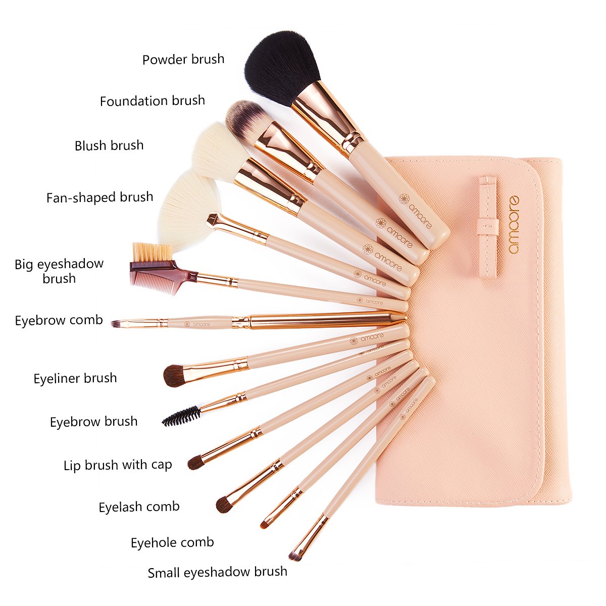 12本セット:パウダーブラシ、斜チークブラシ、ファンデーションブラシなど日常のメイクに必要なブラシが全て揃っています。