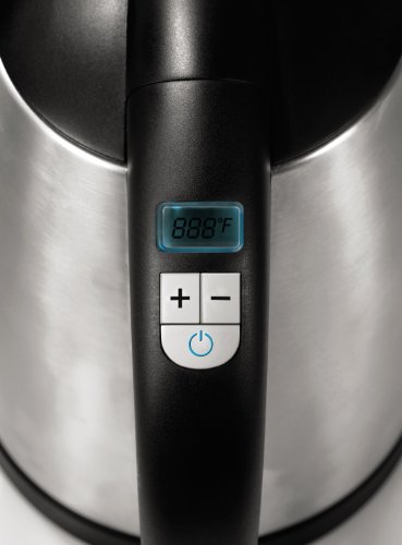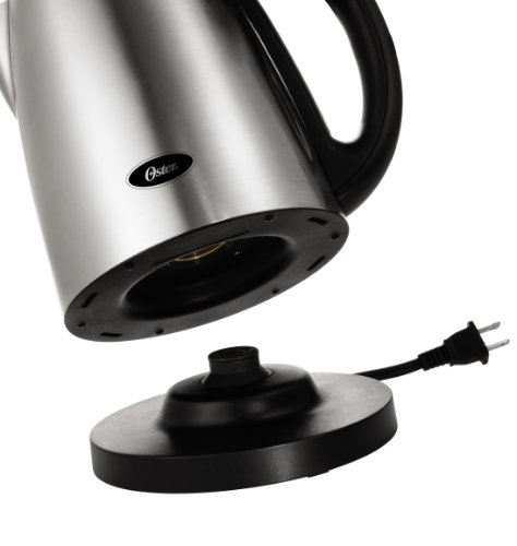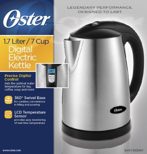 Make the perfect cup of tea with this Oster Digital Electric Kettle. Easy to use controls allow you to set the kettle to any one of 11 temperature settings from 110-212 degrees Fahrenheit. The brushed stainless steel finish gives this kettle a modern look. Featuring an automatic shutoff, a hinged locking lid, a power light and a water window, the kettle stores up to 1.7 liters of piping hot water.Feature