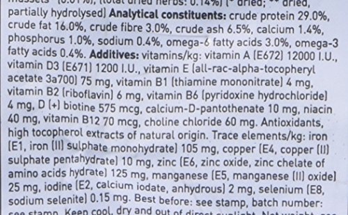 素材構成:成分:粗タンパク質 - 29.0 %、粗脂肪 - 16.0 %、粗繊維 - 3.0 %、粗灰分 - 6.5 %、カルシウム - 1.40 %、リン - 1.00 %、ナトリウム - 0.40 %、マグネシウム - 0.08 %、カリウム - 0.60 %、オメガ6脂肪酸 - 3.00 %、オメガ3脂肪酸 - 0.40 %、代謝エネルギー:368.8kcal / 100g