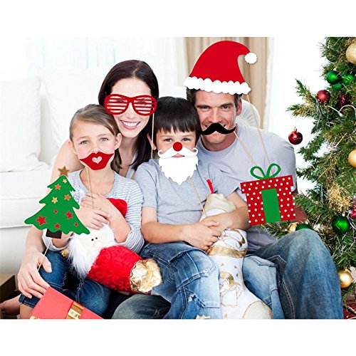 CHRISTMAS PARTY SUPPLIES: This kit comes with a huge variety of novelty "disguise" booth photo props for all your playful and party occasions. Includes New Years ornaments, antlers, mustaches, tree, smoking pipes, and much more.