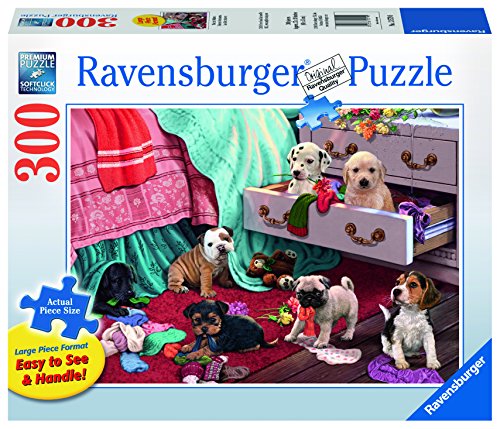 -. Binding : Toy -. Brand : Ravensburger -. EAN : 4005556135790 -. Feature : Puzzle Measures: 27" x 20" / Large Piece Format - Easy to see & handle / Puzzles are fun! on your own, or with family and friends / Relax from your busy life, build a beautiful image and a new memory / Take a moment to slow down and experience the pleasure of a puzzle -. Genre : strategy -. ItemPartNumber : RAV13579 -. Label : Ravensburger -. Manufacturer : Ravensburger -. Model : 13579 -. MPN : 13579 -. PackageQuantity : 1 -. PartNumber : 13579 -. ProductGroup : Toy -. ProductTypeName : TOYS_AND_GAMES -. Publisher : Ravensburger -. Studio : Ravensburger -. Title : Ravensburger Mischief Makers Large Format Jigsaw Puzzle (300 Piece) -. Warranty : Lifetime warranty against manufacturer's defects