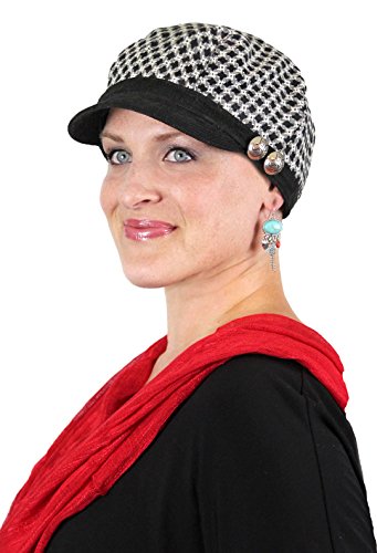 Beautifully trimmed with a short, corduroy brim and two faux silver buttons. Our Checkmate newsboy style hat gives you complete coverage over the ears and at the neckline. 2 inch brim frames your face without being over powering. Especially nice for women with small heads and features.