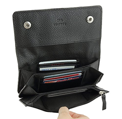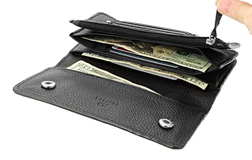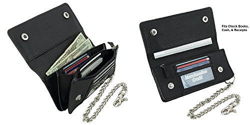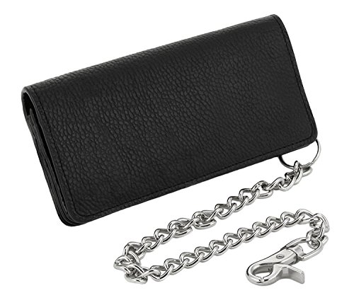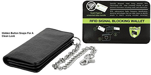 -. Feature : HIGH QUALITY MATERIAL: Real genuine cow mill pebble leather: durable for every day use; 15" inch steel chain with swivel lobster claw / CLEAN LOOK AND STYLISH: Polyester inner lining, 2 large hidden button snap closure, snaps cannot be seen from the exterior for a clean polished look; DIMENSIONS: 7.5"L x 3.87"W x 1"Thick / ELITE FEATURES: Clear ID window pocket for driver's license, 11 credit card slots, 2 bay bill pocket: fits checkbook also, just in case you wonder, it can fit a cell phone (5"L x 2.5'W), zippered pocket for everything else such as: coins and change, receipts, cash money bills, and more. / PROTECT YOURSELF FROM IDENTITY THEFT: (Radio Frequency Identification): Protects you from identity theft and electronic pick pocketing, layered with unique RFID signal blocking composite to protect credit cards and driver's licenses from electronic theft. / PEACE OF MIND: CJ's Budget Buys offers extended 60 Day Warranty for your product. Warrants against defects in materials and workmanship under normal use only. We got you covered after your purchase! BUY WITH CONFIDENCE!