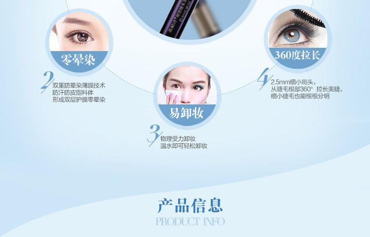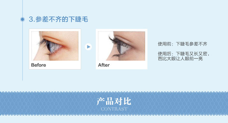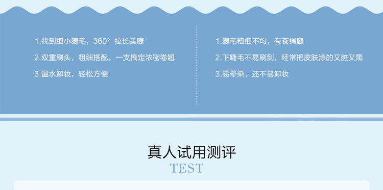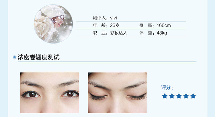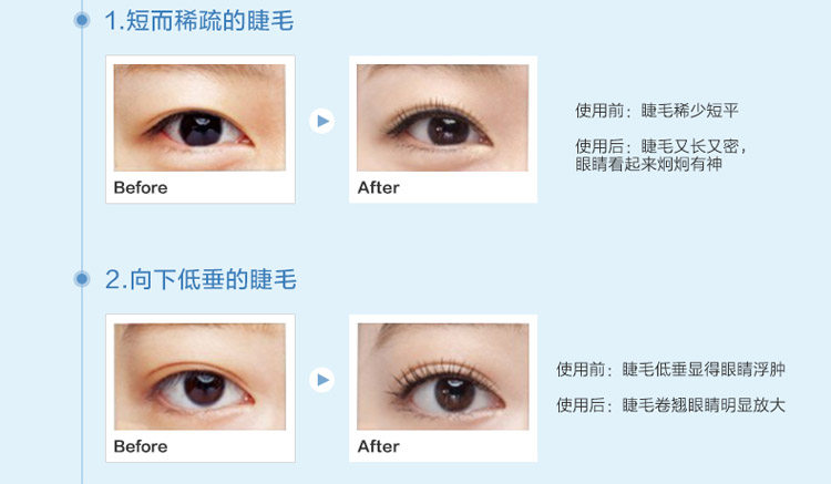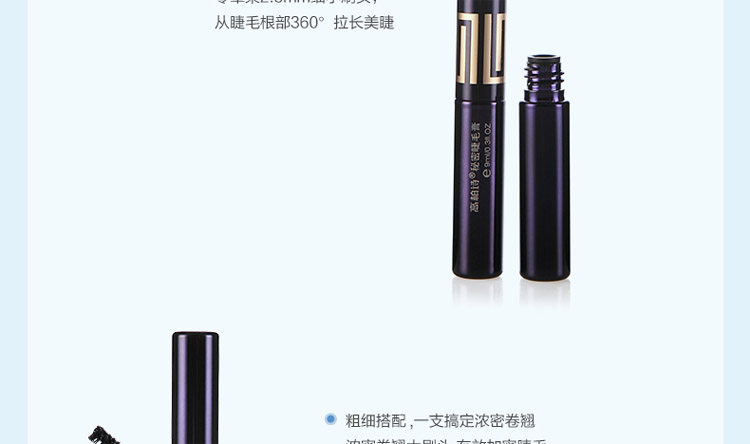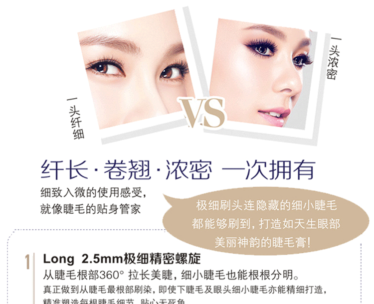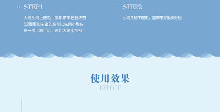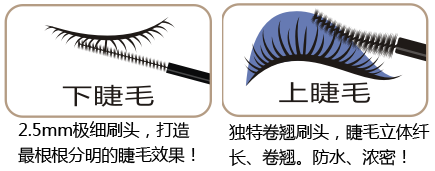 先用极细刷头从根部刷上下睫毛,再用大刷头加密上睫毛,达到浓密卷翘的立体纤长妆效。