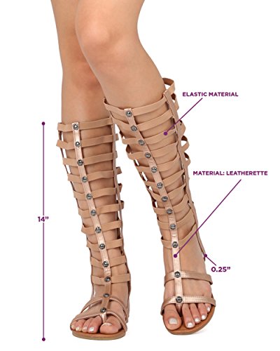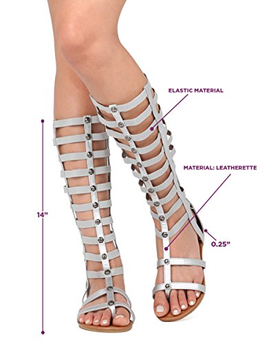 Product Description These stylish knee high gladiator sandals are made with a leatherette upper, open toe and metallic hardware. Also made with a strappy caged construction, elastic straps on shaft and flat heel. Finished with a hind zip for easy slip on and off. 0