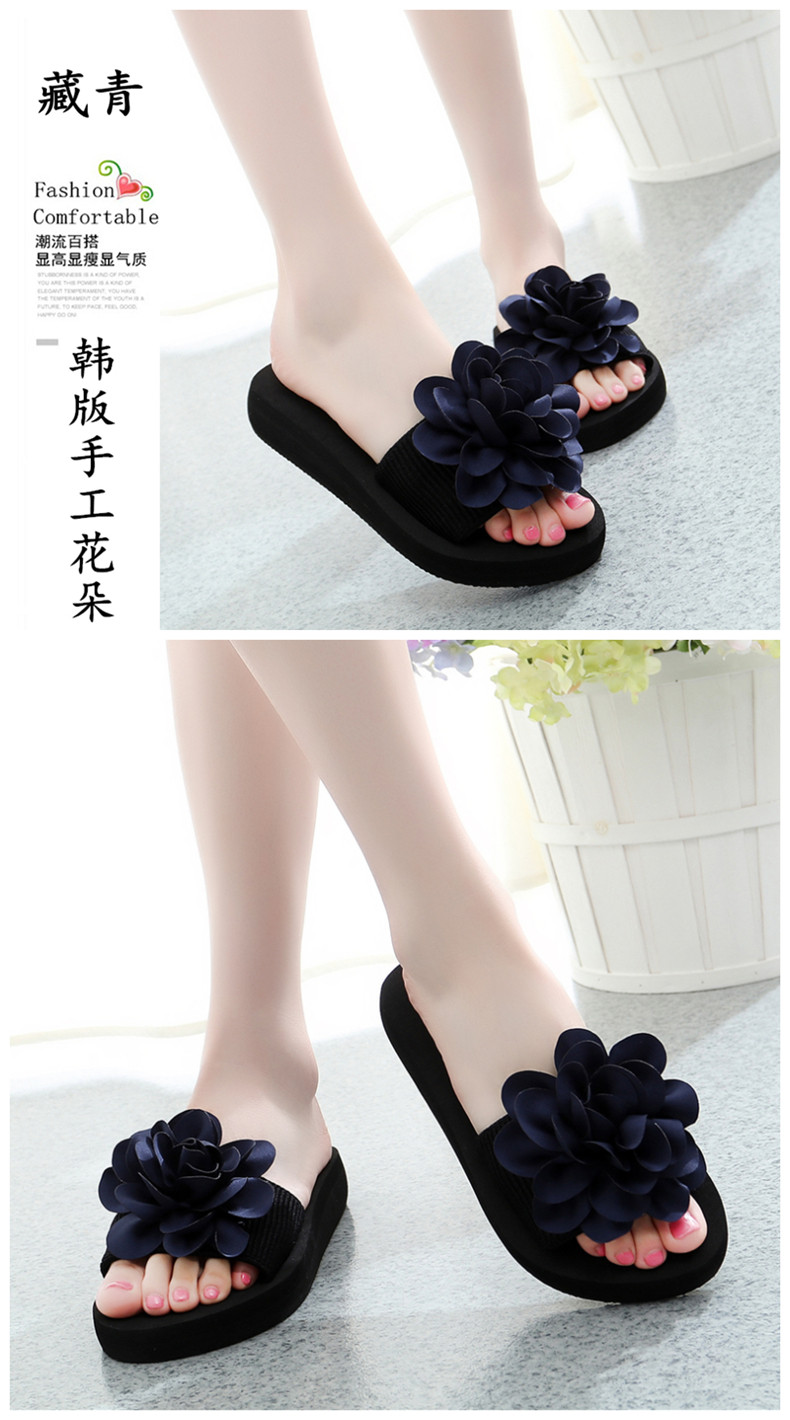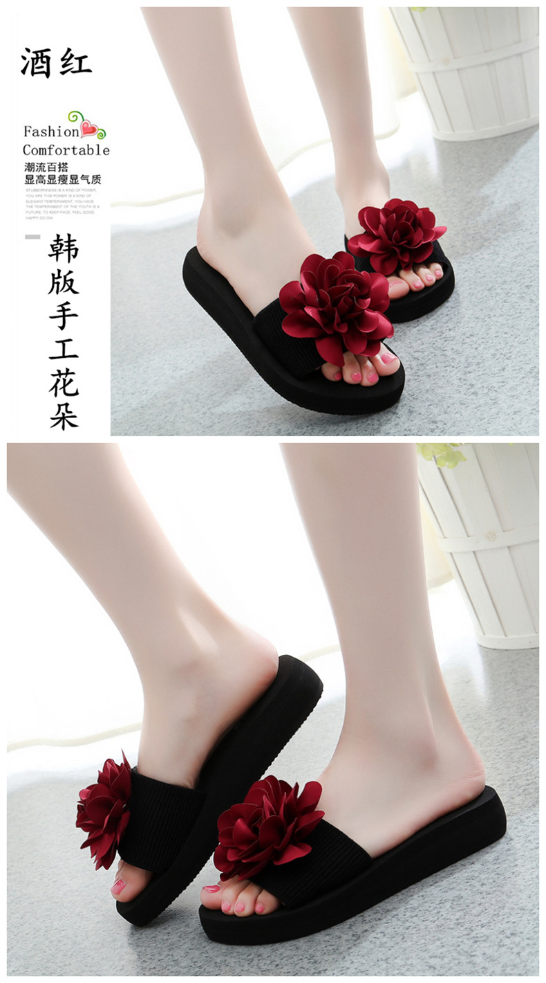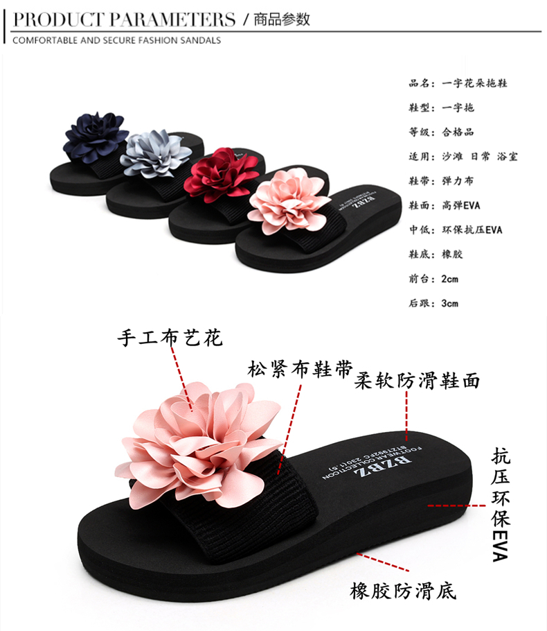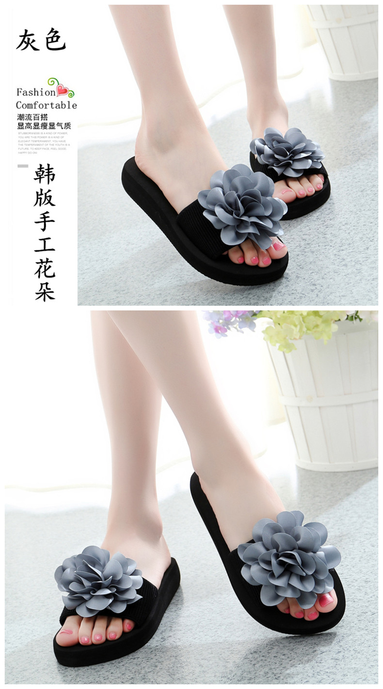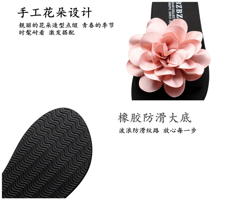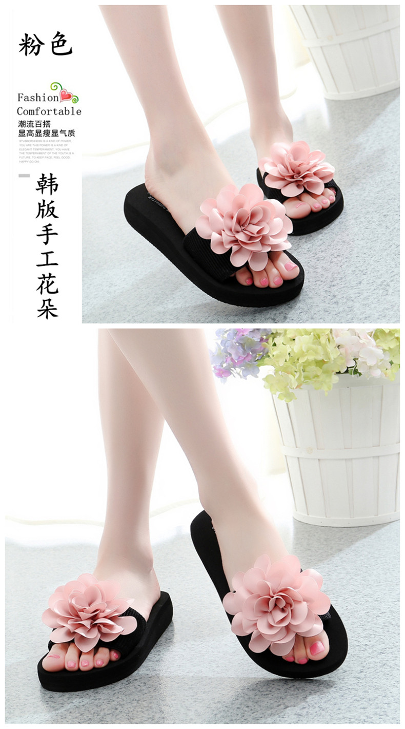 防滑舒适平底一字拖鞋女夏韩版厚底凉拖鞋时尚手工花朵沙滩鞋