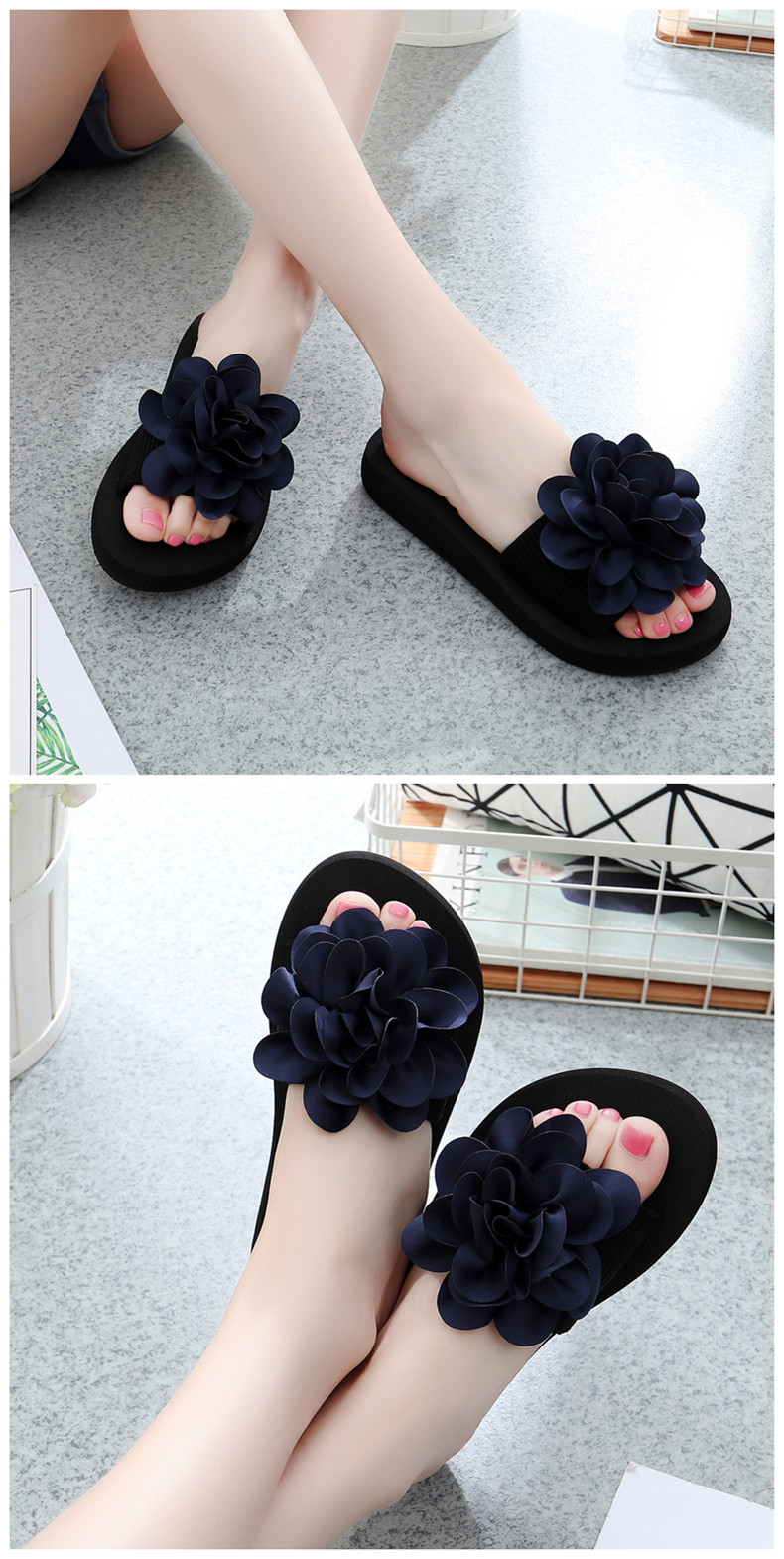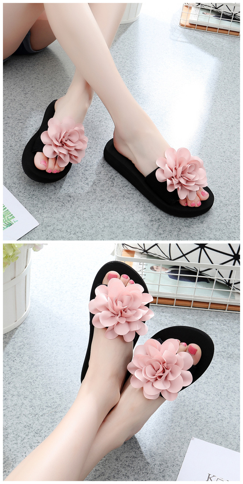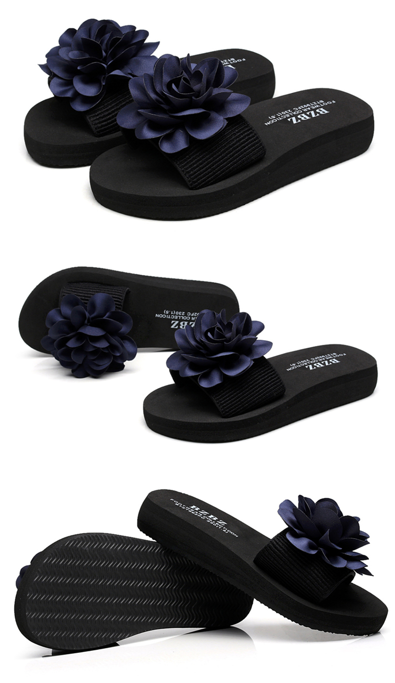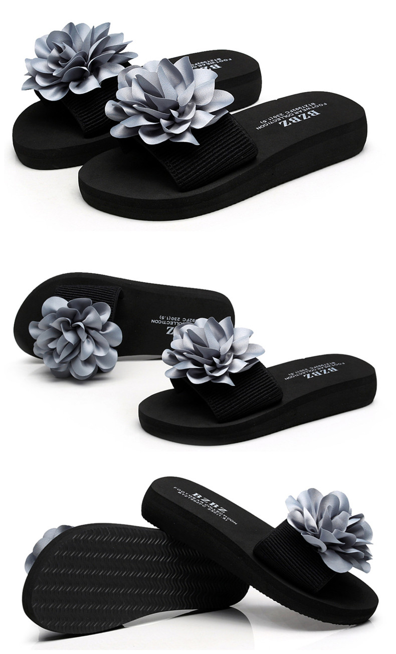 防滑舒适平底一字拖鞋女夏韩版厚底凉拖鞋时尚手工花朵沙滩鞋