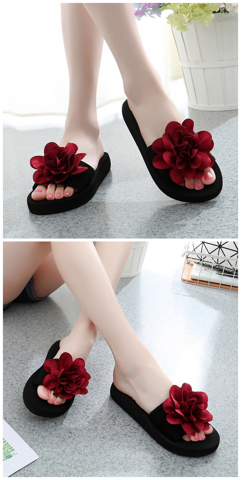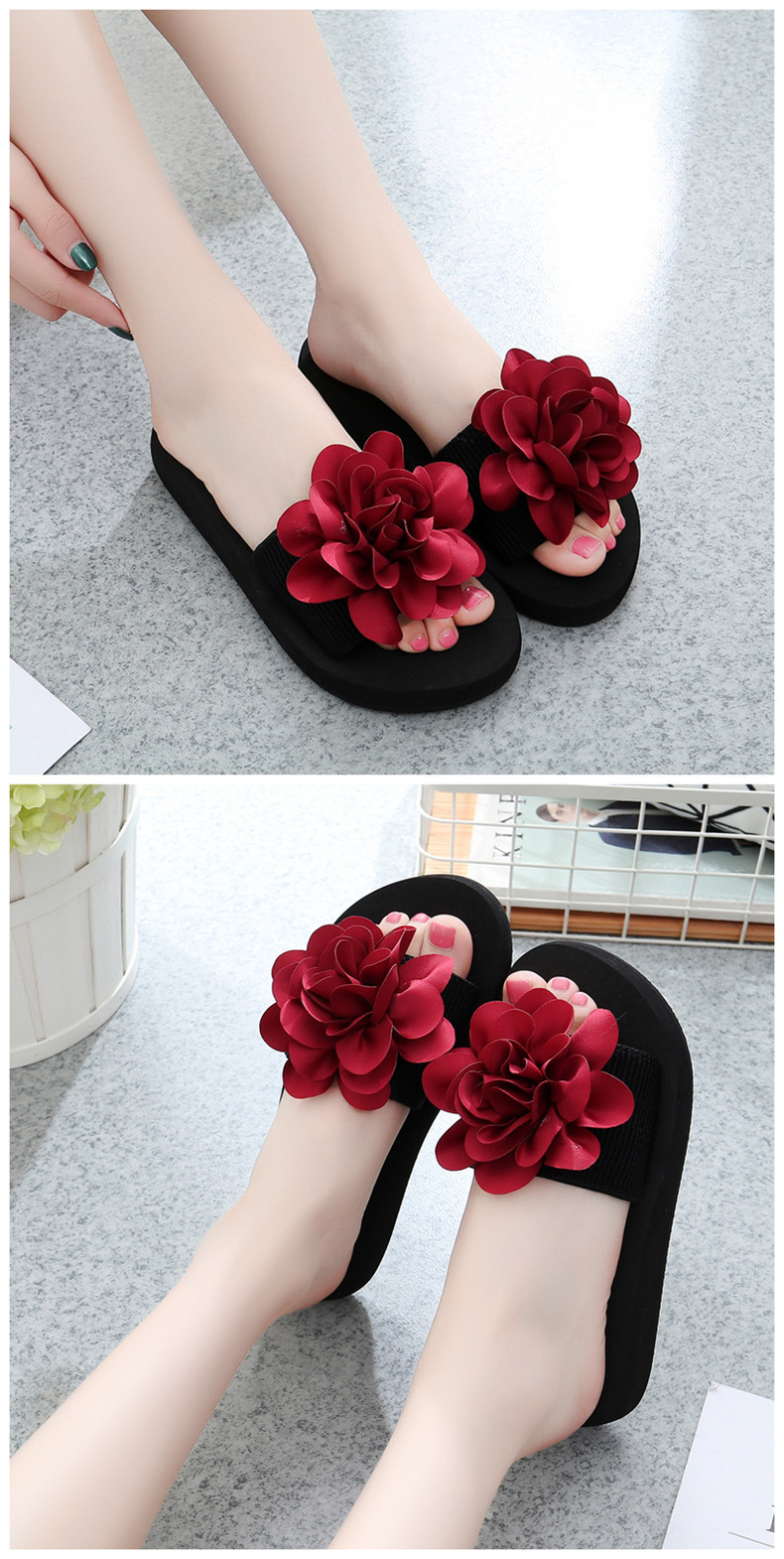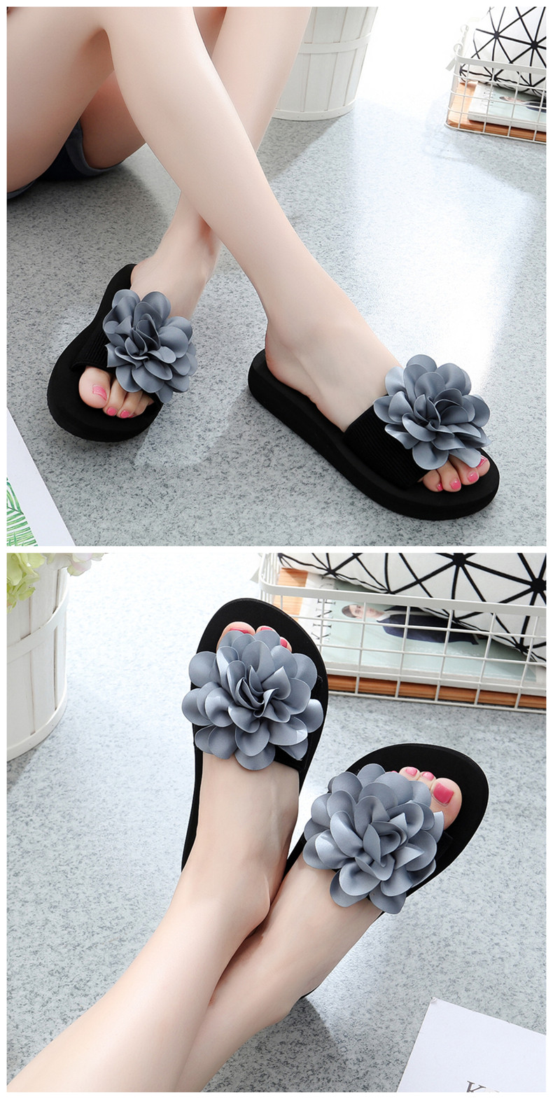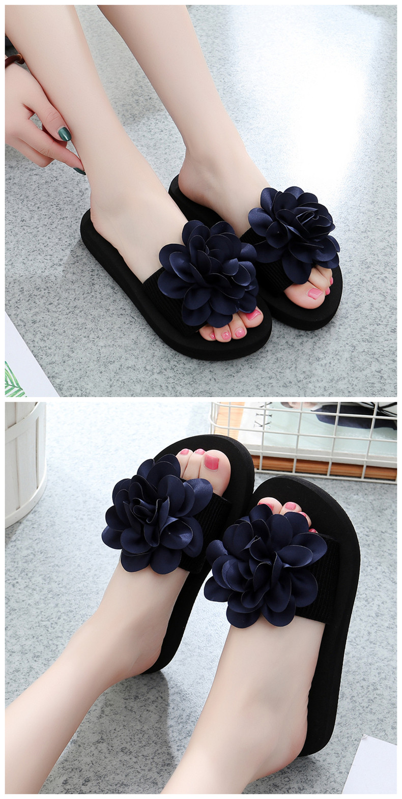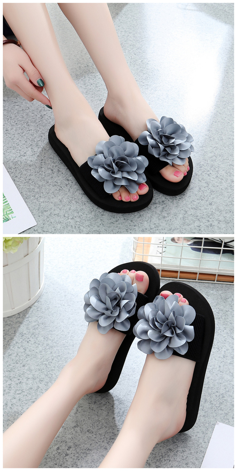 防滑舒适平底一字拖鞋女夏韩版厚底凉拖鞋时尚手工花朵沙滩鞋