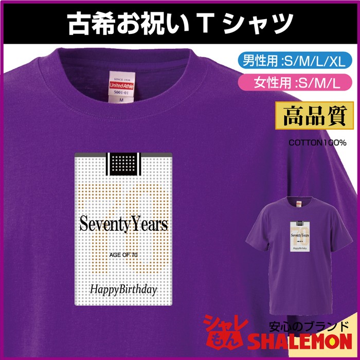 70歳の古希お祝いのプレゼントに人気のシャレもんTシャツはいかがですか?紫のちゃんちゃんこより実用的で、贈った方を笑顔にできるTシャツです。古希祝いの記念撮影でも楽しいデザインで思い出に残る笑顔の写真がとれます。当店シャレもんの古希祝いグッズはTシャツ以外にもトレーナーや帽子、靴下や下着など、一緒に買うとさらに喜ばれる商品満載です。