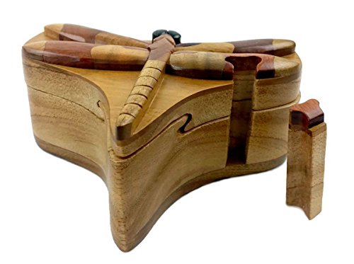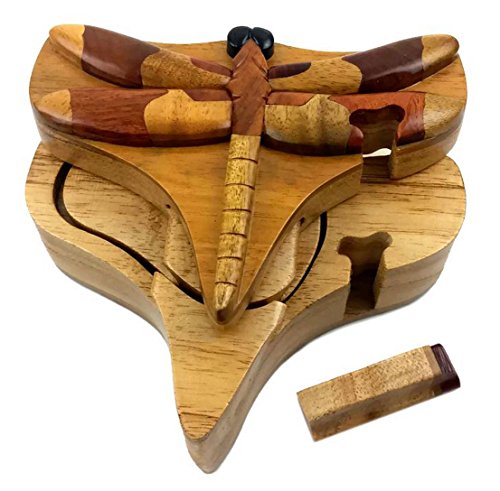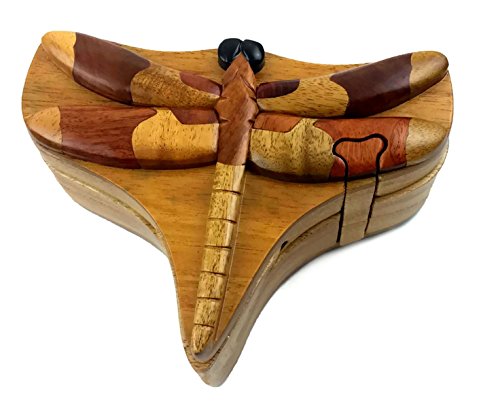 Dragonfly, All Natural Exotic Woods Puzzle Box, 6 x 4.5 x 2.5" with Sliding Wooden Key Lock, Sliding Cover and Inner Lid to Hidden Compartment. Hand-made Wood Onlay Design on Lid.