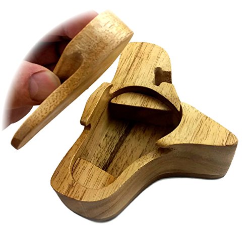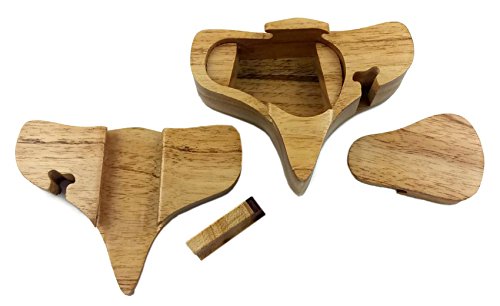 Beautifully hand-crafted puzzle box with carved and inlaid woods applique decor on lid. Remove wooden slider key, slide off cover then remove inner lid to reveal hidden compartment.