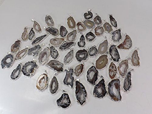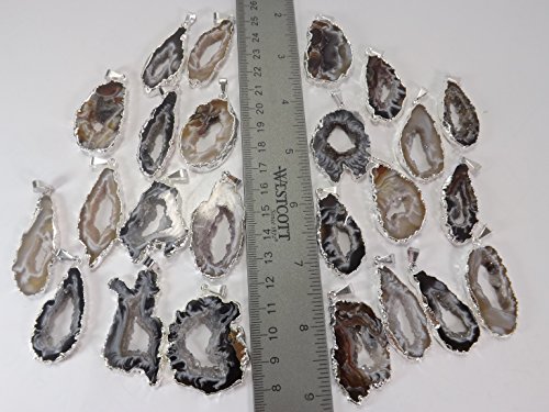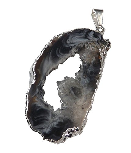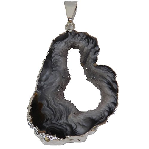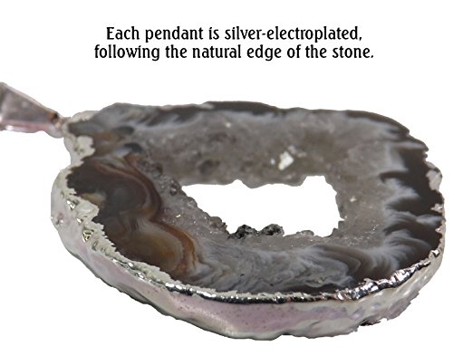 Agate Pendant Jewelry, Geode Slice, a Unique Polished Natural Stone from Brazil, with a Center of Druzy Crystals, Medium Size Between 1 1/4" to 1 7/8" with a Silver-Plated Edge, in Gift Box