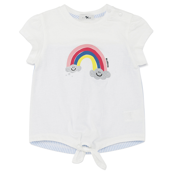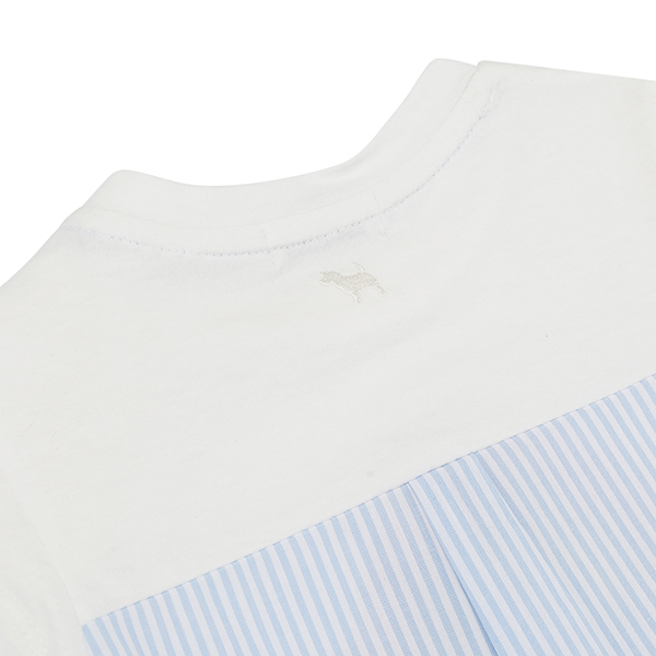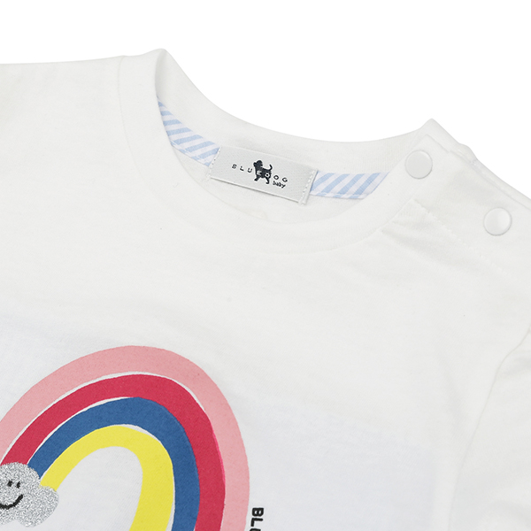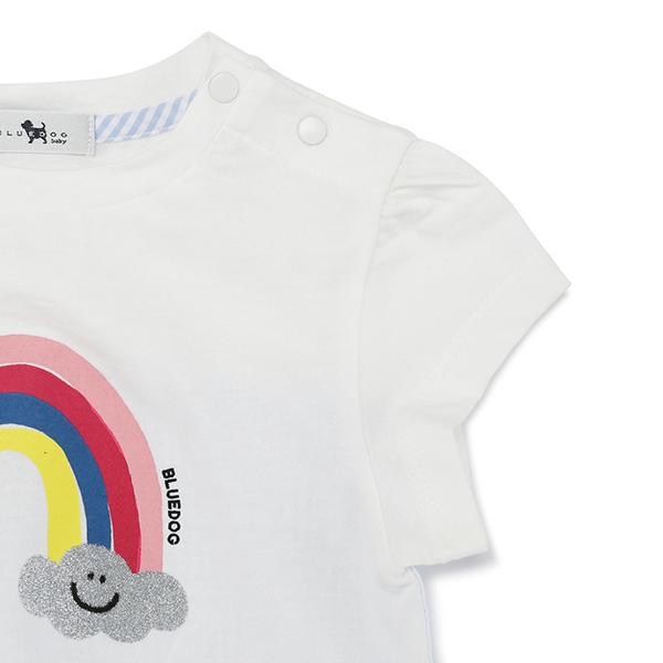 무지개 포인트 나염이 들어간 귀여운 여자라인의 티셔츠입니다. 등판에 시원한 STRIPE우븐이 매치되어 산뜻한 느낌을 주며