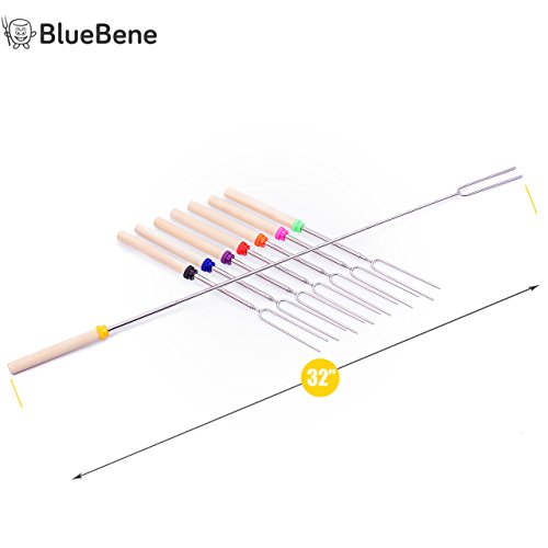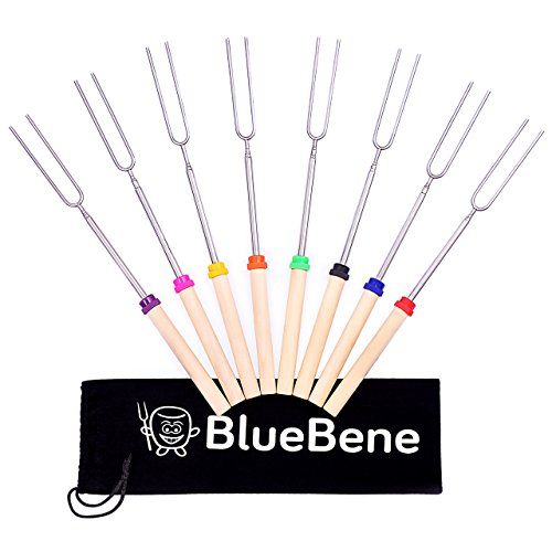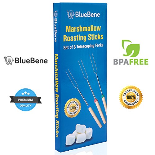 MARSHMALLOW ROASTING STICKS BY BLUEBENE - 8 TELESCOPING SKEWERS FOR HOT DOG AND MARSHMALLOWS - 32 INCH SAFE FORKS BEST FOR CAMPING WITH BONUS 10 BAMBOO STICKS, CANVAS POUCH & S'MORES RECIPES EBOOK