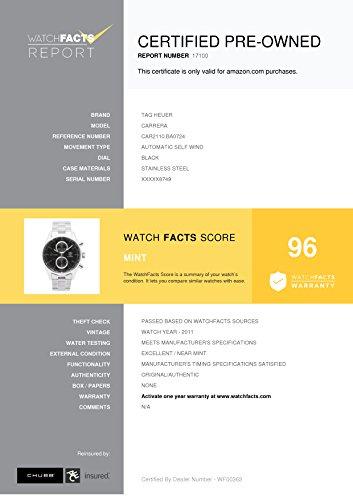 -. Feature : Tag Heuer Carrera CAR2110.BA0724 with 7.5 band, stainless-steel bezel and black dial / Authenticated by WatchFacts. Grade Rating: 96 / Condition: Mint / No papers offered with this watch / Automatic-self-wind movement / Watch year: 2011