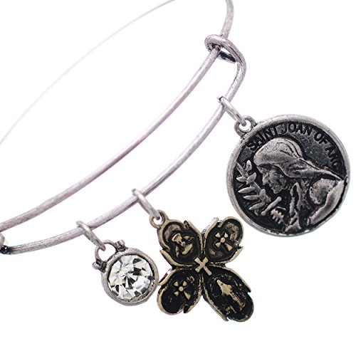 -. Feature : Religious bracelet featuring Joan of Arc and 4-Way Cross Medals / Size: 2.5 inch opening for a small to medium size wrist / Fashionable silver tone wire bangle with hook closure / Crystal dangle charm adds a sparkle accent to the design / Joan of Arc has been a popular figure in literature, painting, sculpture, and other cultural works since the time of her death, and many famous writers, filmmakers and composers have created works about her.