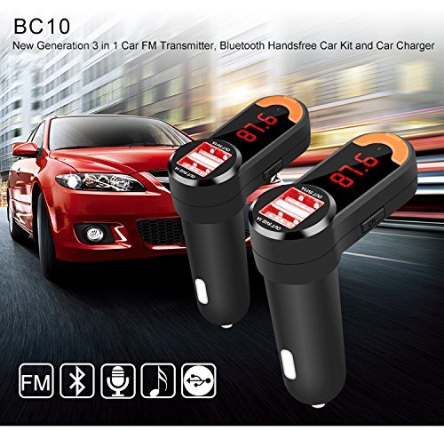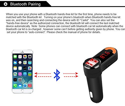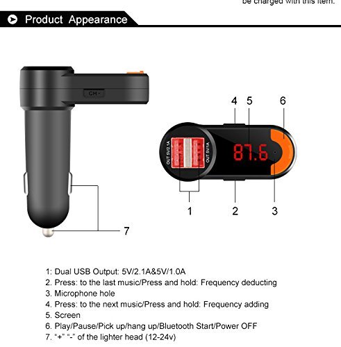 Notes: 1. When use FM transmit function ,volume will not be too much (usually below 29) in order to avoid sound distortion, please use the car stereo to adjust the volume. 2. The machine built-in antenna for FM transmitting, so please avoid using the broadcasting station frequency that is with strong signal so as to get better sound effect. 3.The method to operate the Bluetooth may differ due to the difference of the phones applied. 4.Some phones may not support automatic connection if they are powered on after the power failure. If so, please connect them by hand. 5.This product is compatible with more than 95% phones on the market but some are still incompatible. Please pay attention to it when purchasing our product. 6.The volume should be proper during the call to avoid affecting the other party. 7.Do not use this product in the environment with high temperature, dusts or moisture. 8.Avoid dropping the product to prevent damage to the surface or the body. 9.Self-maintaining is prohibited, if any, please contact our dealer Specification: Rated Working Volltage:12V Frequency range: 87.5-108.0Mhz Output Frequency: 20Hz-15KHz Limited Working Voltage: 9-26V Rated current: 90mA Power consumption: 1W Work temperature: 0-50°C Support file format: MP3/WMA USB Charge output: 5V/2.1A Music format: MP3 format USB Maximum support: 32G Bluetooth version 2.1 + EDR Bluetooth sound Processing:A2DP(Advance Audio Distribution Profile) Transmit distance: 10m Mic Effective Distance:0.5-2m what's include: 1 x Bluetooth Car Kit Charger 1 x User ManualFeature