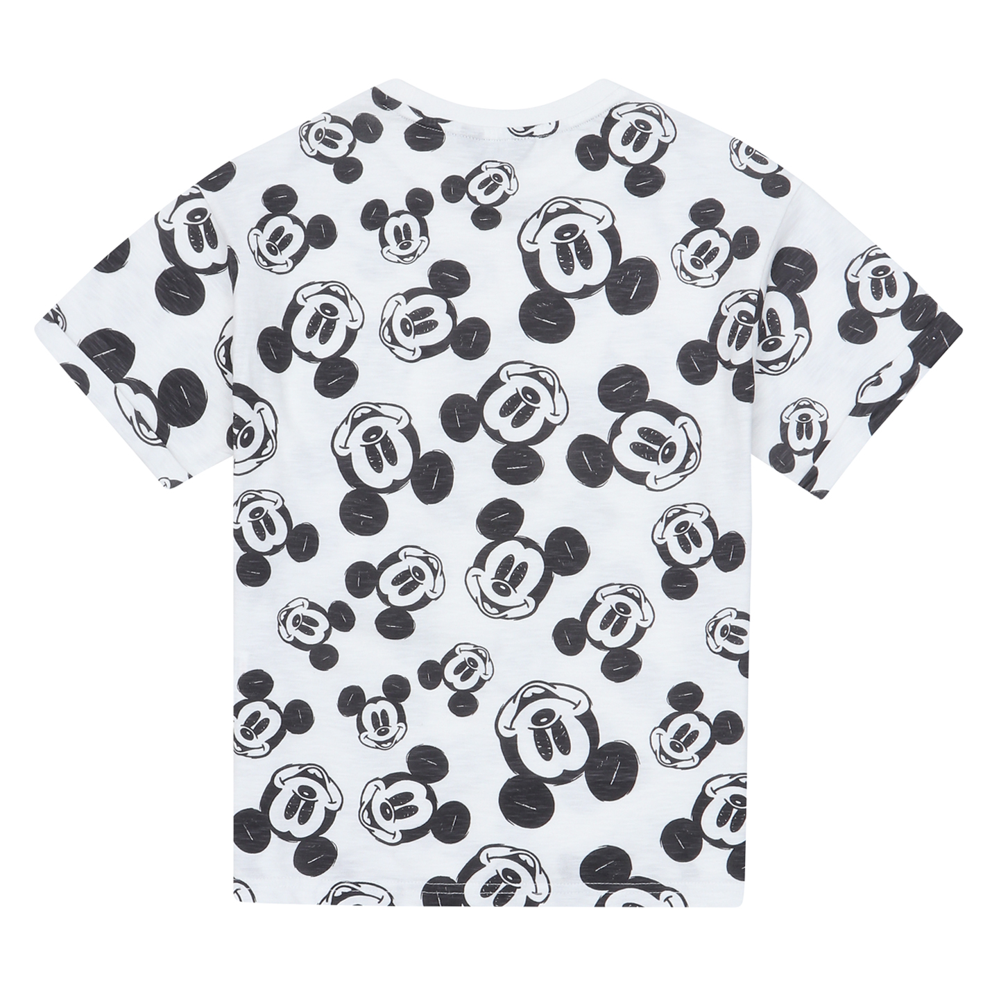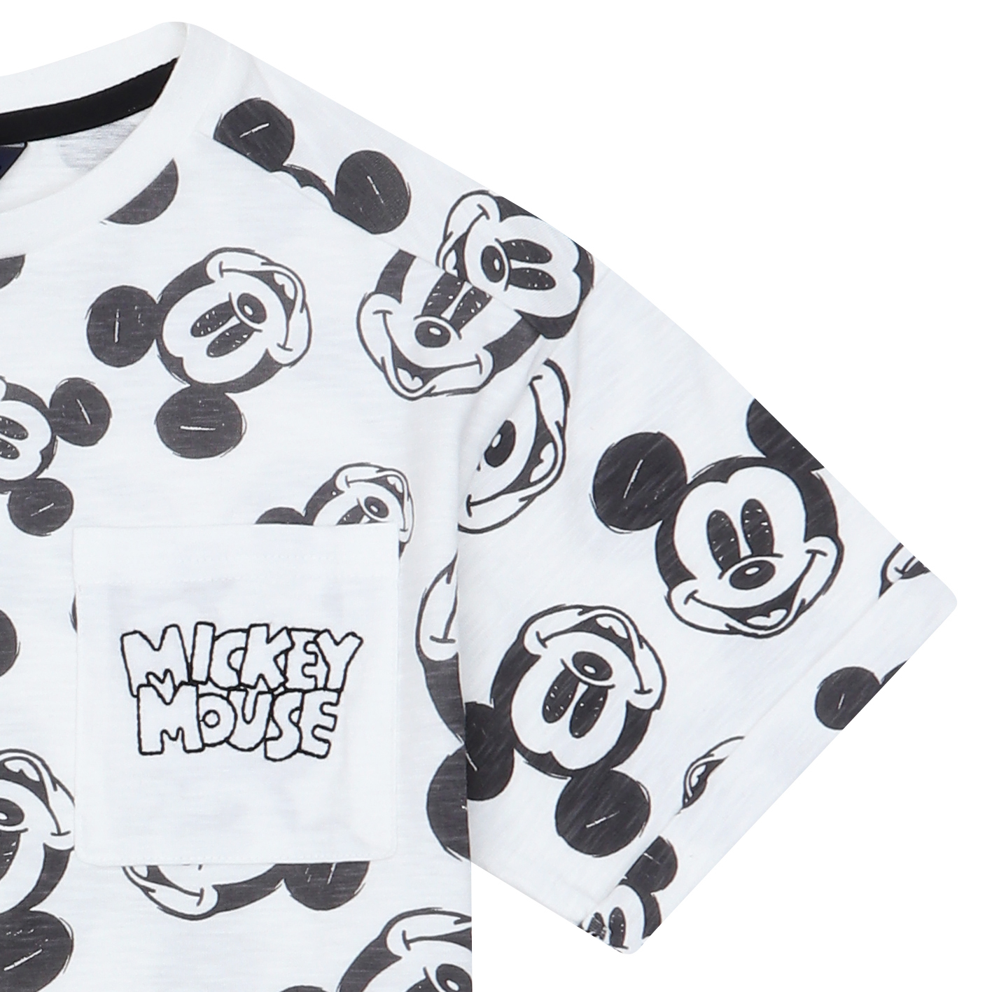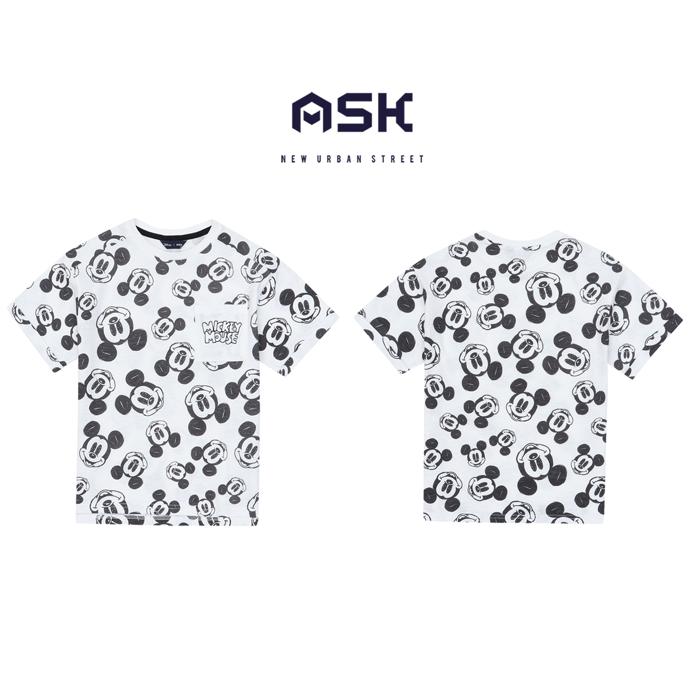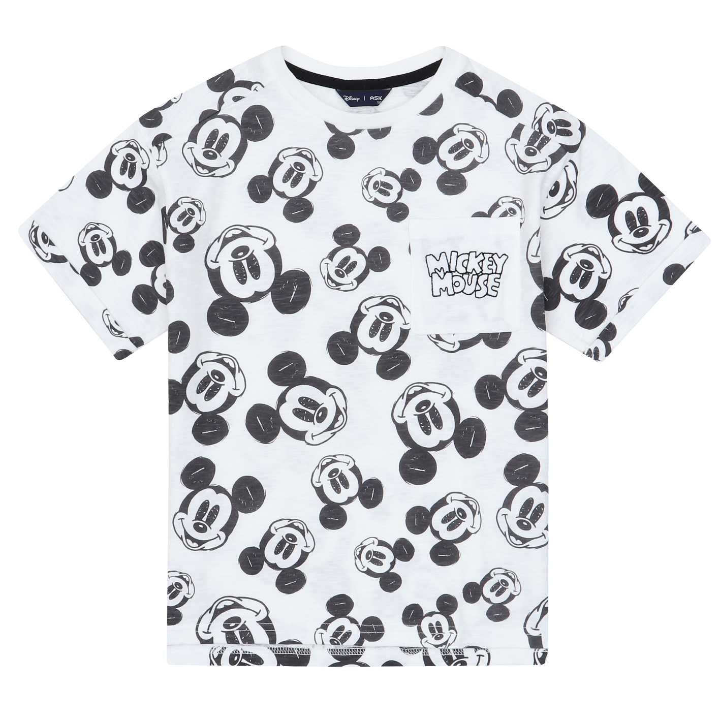 30수 슬럽 소재의 전판 나염 티셔츠. 디즈니 미키 전판 나염과 주머니에 미키 자수를 포인트로 준 스타일. 토들러부터 저학년까지 판매하기 좋은 아이템임.