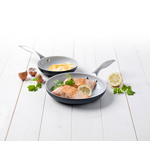 The GreenLife Classic Gourmet Pro 8" and 10" Ceramic Non-Stick Open Frypan Set is both durable and convenient. The professional quality hard anodized body has excellent heat conduction and a sturdy base. The ergonomic stainless steel handle with a non-slip silicone insert helps this cookware set become oven safe up to 392°F. Thermolon is manufactured without PFAS and PFOA, does not contain any lead or cadmium and allows for less fats and oils to be used. It gives you ideal frying results with lower heat settings. The matte dishwasher safe coating gives this open frypan set added convenience.Feature