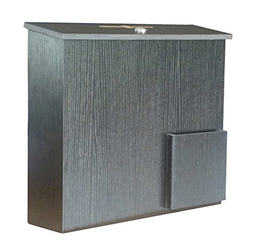 Black finish looks great in any location. Side pockets conveniently holds input cards or donation envelopes. Lock and key is included. Dimensions: Box: 15"w x 12-3/4"h x 3-5/16"d. Inside Box: 14-3/16"w x 12-9/16" x 2-5/8"d. Pocket: 5-7/16"w x 5-3/16"h x 5/8"d. Inside Pocket: 4-3/4"w x 4-3/4"h x 1/2"d. Slot: 5"w x 3/8"h, 1"h at circle. Weight: 5-1/2 lbs.