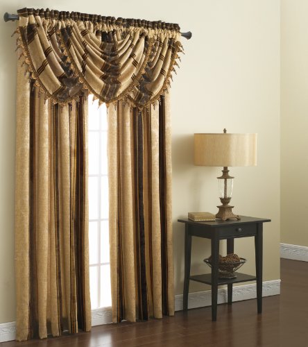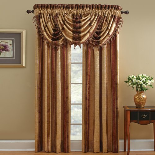 This refined window ensemble will dress up any room in your home. The neutral base printed with a subtle texture coupled with multi-colored emberline stripes can easily fit into any color scheme in your home. The waterfall swag valance is finished with complimenting tassel fringe. To achieve this look, use 3 valances per window.Feature