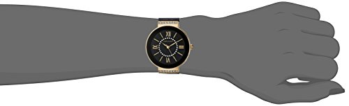 Slightly domed mineral crystal lens; glossy black dial with 29 clear Swarovski crystals in center ring; gold-tone hands and markers