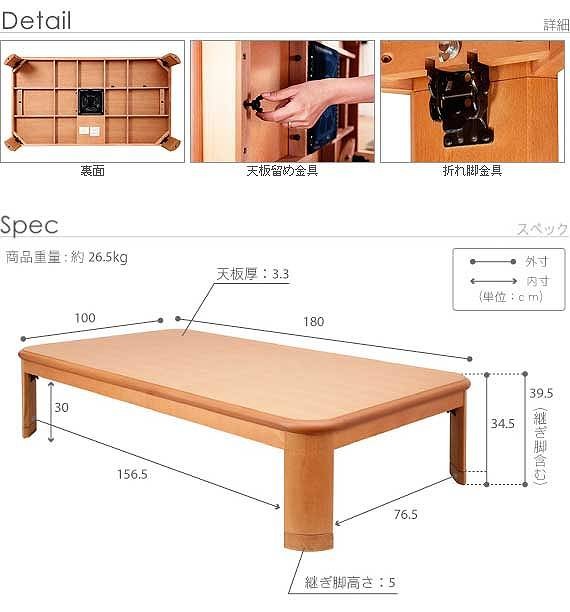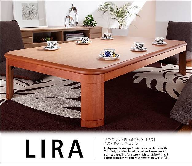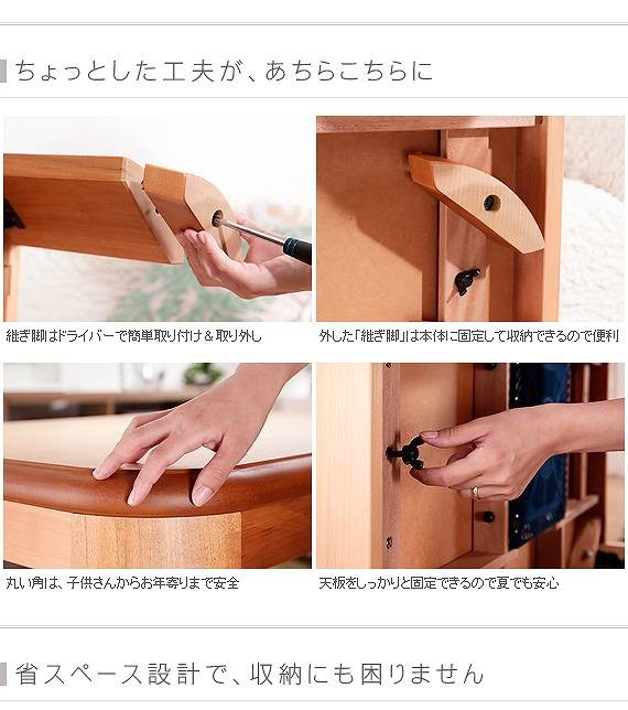 商品について:角が丸く優しさあふれるシンプルなデザイン。こたつもテーブルもこれ1台でOK♪使わないときは折畳んですき間へ収納(厚さ15cm)。便利な継ぎ脚付(高さ5cm)。600W薄型石英管ヒーター(手元コントローラー式)。