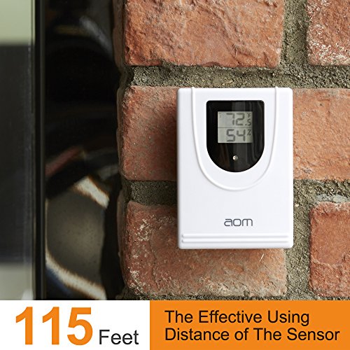 Transmission Sensor Wireless transmission sensor can measure outdoor humidity and temperature environmental conditions accurately from your local station. The RF 433 MHz sensor size is 65x90x26mm ,with the range of distance is Range up to 115 feet (35 meters). It is a waterproof transmission sensor, but the main weather clock unit is not waterproof.