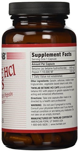 Twinlab Betaine HCL Caps provide powdered Betaine HCL with Pepsin in gelatin capsules for quick acting and enhanced effectiveness.