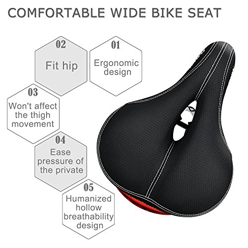👍QUALITY GUARANTEE, PROFESSIONAL CUSTOMER SERVICE - 1 year warranty! The size of our comfortable wide bike seat is 11 x 8.7 inch(L x W) , makes pressure well-dispersed, brings rider great comfort like sitting in soft sofa. We believe you'll love this bike saddle, if don't like or have any problems, pls contact us, 100% refund or replace. This bicycle seat will be a good gift for your lover, families or friends