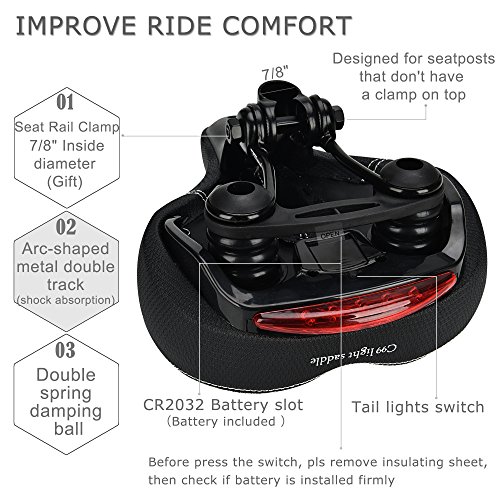 👍WITH WATERPROOF BRIGHT TAIL LIGHT UNIQUE DESIGN - more eye-catching & safety when riding at night or rain! The safety light of DAWAY C99 wide bicycle saddle cushion has 5 pcs super bright LEDs, waterproof, powered by 1 pcs CR2032 battery(Included), work time up to 36 hrs ("steady" mode). 3 lighting modes, offer optimal visibility for safe cycling, solve the trouble of buying & installing taillight. In perfect protection at night, ensure safety