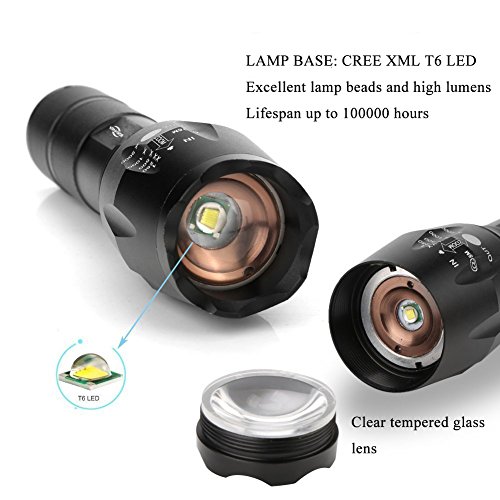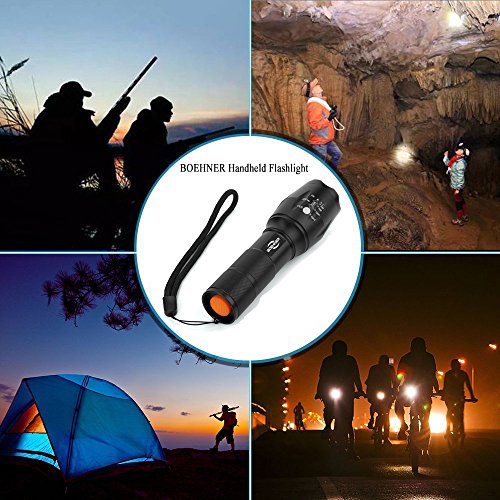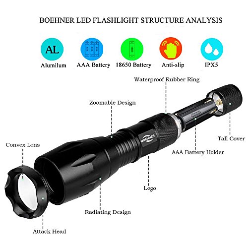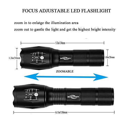 Tactical Flashlight, BOEHNER Portable Ultra Bright XML T6 LED Flashlight, Outdoor Water Resistant Taclight with 5 Light Modes and Zoom Function