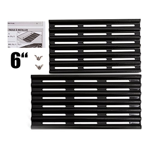 DIMENSIONS - The two grates in each package are slightly different in size so that one can be slided into another. Each grate's width and length are about 6 inch and 13 inch respectively. *Be aware that the number of grates you need depends on the size of your grill surface.