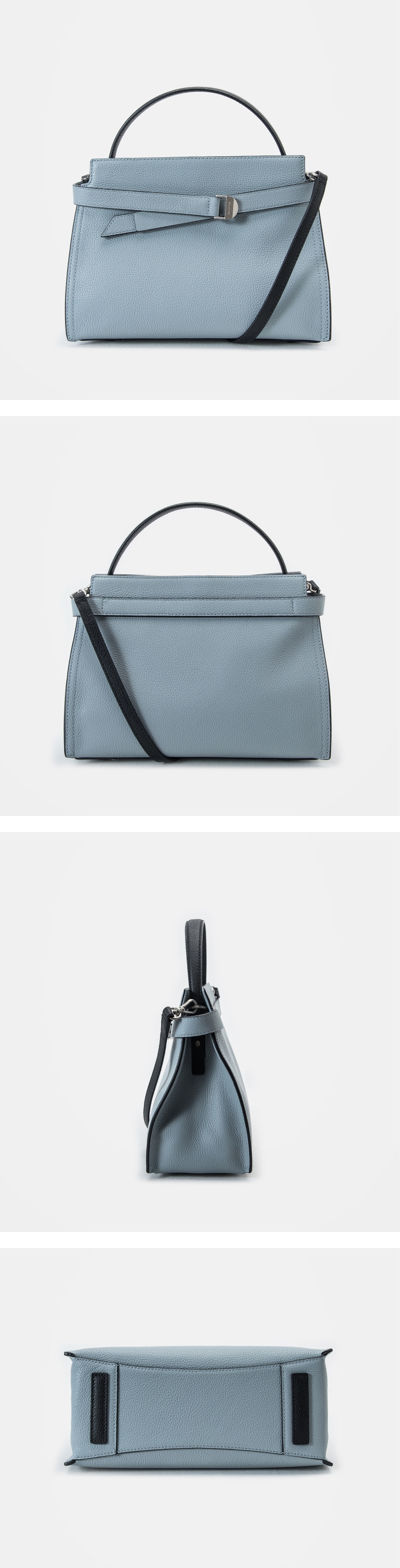 유색 컬러의 엣지와 핸들은 블랙으로 매치해주어 가방의 윤곽을 확실히 살리고 완성도를 높여줍니다.