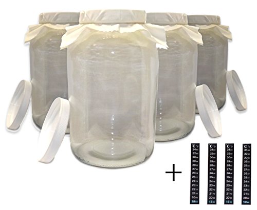 KombuJars Kombucha Jar 1 Gallon Glass (4 Pack) Brewing Fermenting Storage Bottle, With Plastic Lid, Thermometer Adhesive Strip, Cloth Cover, and Band