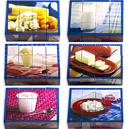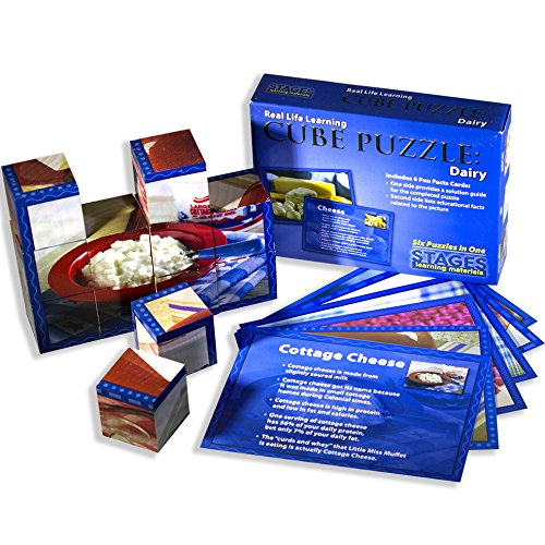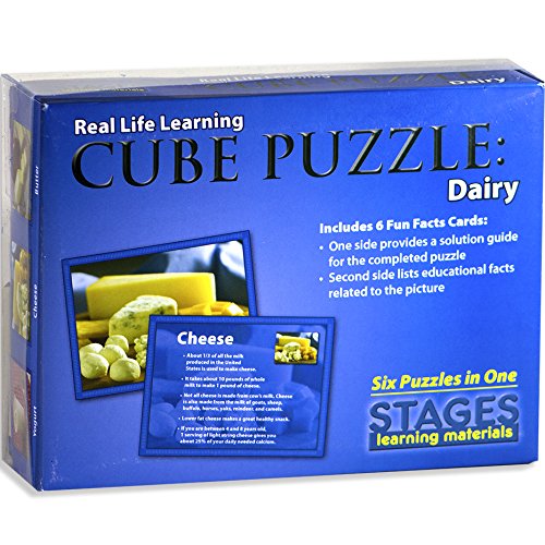 ReleaseDate : 2017-07-01 Studio : Stages Learning Publisher : Stages Learning Binding : Toy Product Description Winner of the Tillywig Toy Awards, each side of the beautifully photographed solid wood cube puzzle is part of a different dairy food picture, so this is like getting 6 different kids puzzles for the price of one! Rotate the beautifully painted wooden cubes to assemble the 6 dairy pictures. The Real Life Learning Dairy Cube Puzzle includes 6 full-color fun facts flashcards. One side of each flash card provides a solution guide for the completed wooden cube puzzle, and the other side lists fun and educational facts related to the picture. Taken alone, or along with the other food group puzzles in the Cube Puzzle series, this is a great way to reinforce healthy eating habits for kids in a fun and engaging way!