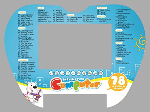 Intelligent learning machine featuring 78 activities and Games! including Learning Letters, Words, Numbers, Math, Music, Keyboard, Memory, Logic, Games and Tools.